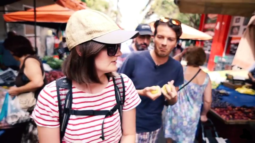 Η Libby από τις Ηνωμένες Πολιτείες και ο Marcel από τη Γερμανία, επισκέφθηκαν για λίγες μέρες την Αθήνα. Περνώντας από μια λαϊκή αγορά της πόλης εντυπωσιάζονται ιδιαίτερα με την ποιότητα των προϊόντων και τις χαμηλές τιμές.