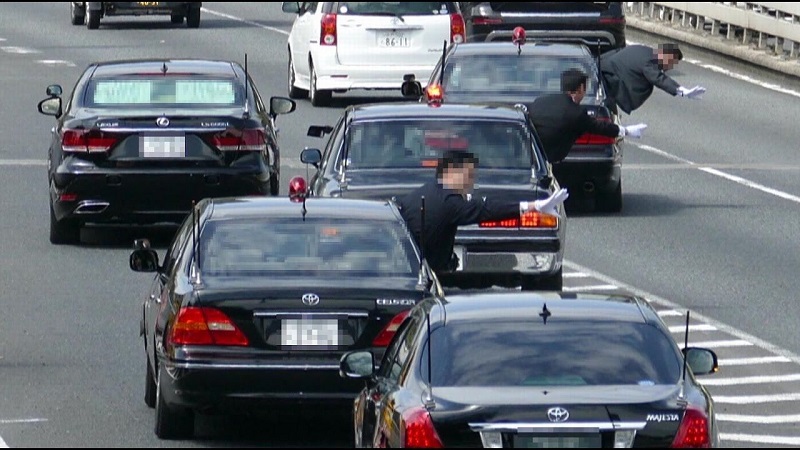 Ο Ιάπωνας πρωθυπουργός και η ακολουθία του οδεύουν σε μια εθνική οδό. Στην Ιαπωνία, όταν ο Πρωθυπουργός Άμπε Σίνζο πλησιάζει στην εθνική οδό, οι άνδρες της πομπής κάνουν σήμα τους οδηγούς να επιβραδύνουν. Οι άνδρες ντυμένοι με μαύρο κοστούμι και λευκά γάντια βγαίνουν σχεδόν ολόκληροι από τα παράθυρα των αυτοκινήτων για να γίνουν ορατοί.