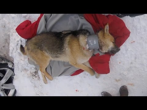 This is the incredible moment that a stray dog’s life is saved by a vet, who removes a large plastic pipe that is constricting its throat.