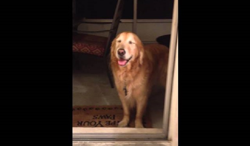 Ένας σκύλος προσπαθεί να σιγουρευτεί αν μπορεί να περάσει από μια ανοιχτή μπαλκονόπορτα.