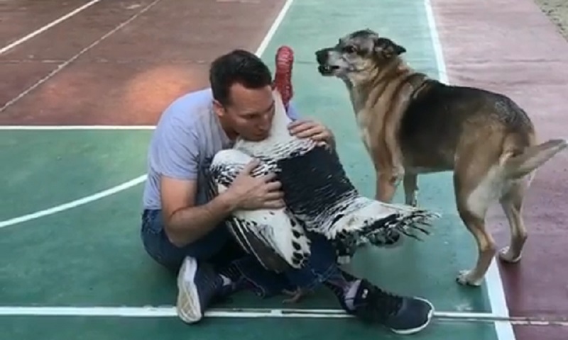 Μια γαλοπούλα και ένας σκύλος ανταγωνίζονται για μια αγκαλιά από το αφεντικό τους.