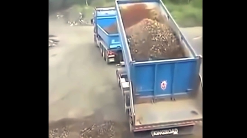 Με μερικές αριστοτεχνικές μανούβρες, ένας οδηγός αδειάζει ένα φορτηγό με δύο κάδους και τρέιλερ.