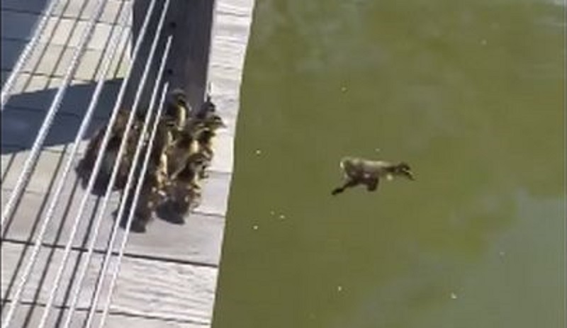 Μια οικογένεια από πάπιες βουτά στο νερό μιας λίμνης από ένα ξύλινο κατάστρωμα. Η μητέρα πηδά πρώτη και περιμένει τα μικρά παπάκια της, που βουτούν το ένα μετά το άλλο με περισσότερο ή λιγότερο δισταγμό.