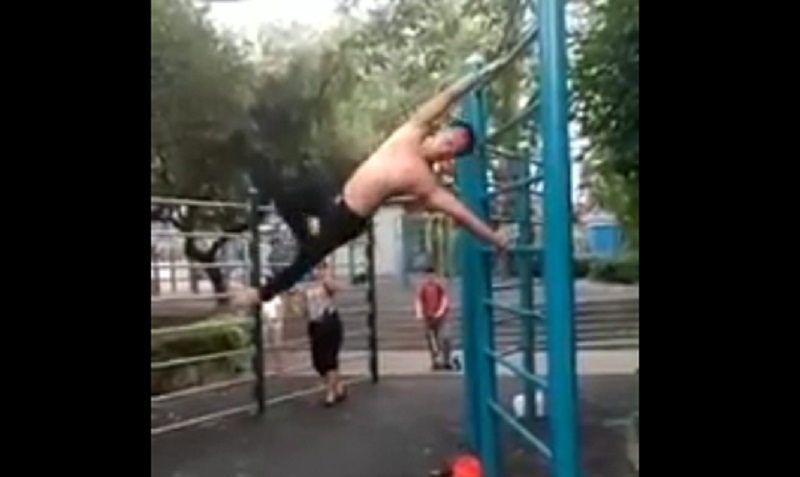 Σε ένα πάρκο στο Χονγκ Κονγκ της Κίνας, ένας άνδρας κάνει ένα εντυπωσιακό ακροβατικό καθώς είναι πιασμένος από ένα μονόζυγο, και δίνει την εντύπωση πως περπατά στον αέρα.