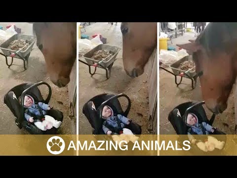 An adorable video shows the moment a horse soothed a crying baby girl – by deliberately rocking her car seat with his nose.