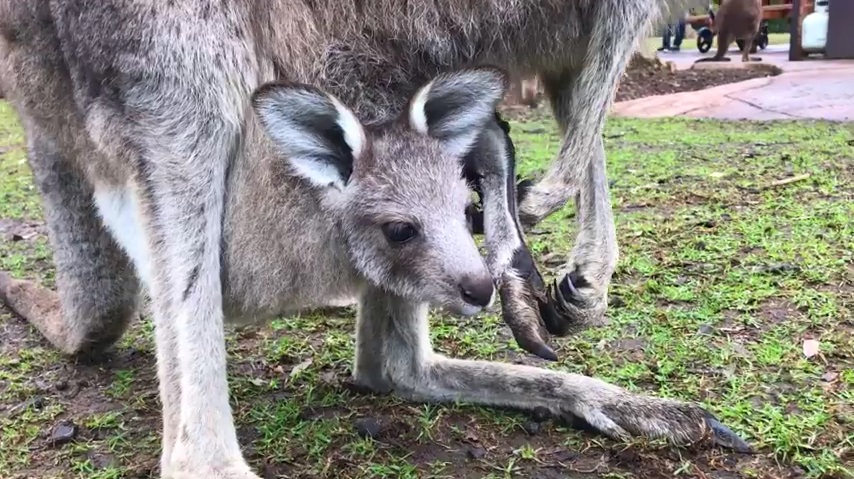 Πλάνα από το αυστραλιανό Πάρκο Reptile στην κεντρική ακτή της Νέας Νότιας Ουαλίας, δείχνουν ένα μικρό γκρίζο καγκουρό που ονομάζεται Jellybean να διασκεδάζει χοροπηδώντας, πριν καταλήξει μέσα στο μάρσιπο της μαμάς του.