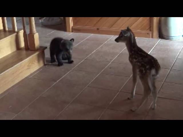 Η αστεία αντίδραση μιας μικρής αρκούδας που συναντά ένα ελαφάκι για πρώτη φορά.