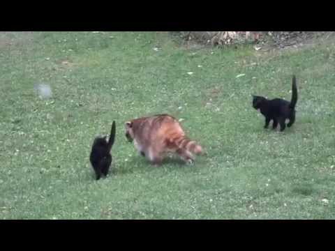 Raccoon and two cats as its bodyguards
