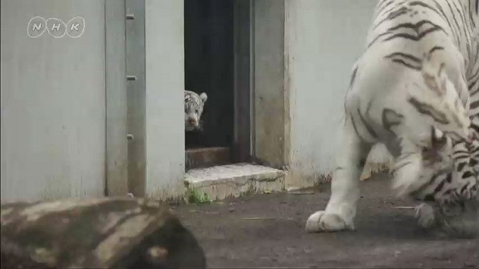 Σε έναν ζωολογικό κήπο στην Ιαπωνία, μια μικρή λευκή τίγρης εμφανίζεται ξαφνικά και φοβίζει τη μαμά της. Ένα απόσπασμα από την ιαπωνική τηλεοπτική εκπομπή “Hello Baby Animal”, που μεταδίδεται στο κανάλι NHK.