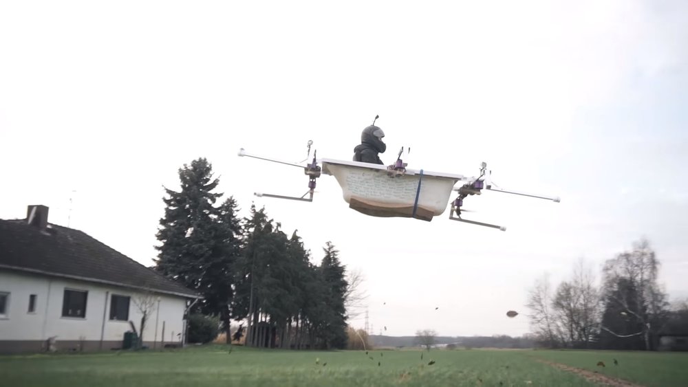 Οι Real Life Guys, δύο φοιτητές από τη Γερμανία, κατασκεύασαν ένα μεγάλο αυτοσχέδιο drone χρησιμοποιώντας ως βάση μια μπανιέρα. Το drone μπορεί να μεταφέρει έναν άνθρωπο για μερικά λεπτά πτήσης. Σε αυτό το βίντεο μας δείχνουν πως κατάφεραν να κάνουν μια εναέρια βόλτα μέχρι το φούρνο της γειτονιάς τους για μερικά ψώνια…
