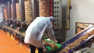 Ένα εργοστάσιο προετοιμάζει έτοιμο φαγητό με σαουάρμα (Shawarma), μια μίξη κρεάτων που ψήνεται σε περιστρεφόμενες ψησταριές. Η περιοχή είναι άγνωστη, αλλά πιθανότατα πρόκειται για τη Σαουδική Αραβία.