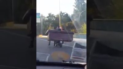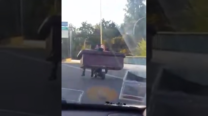 Σε ένα δρόμο στο Παρίσι, τρία άτομα κάθονται πάνω σε ένα καναπέ, που είναι τοποθετημένος πάνω σε ένα σκούτερ.
