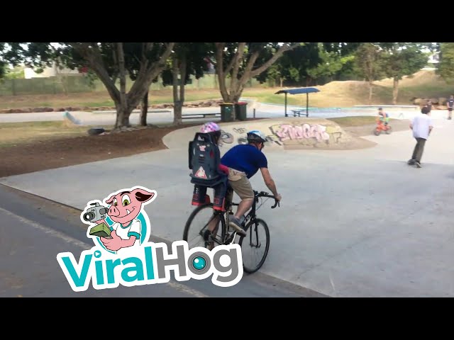 A dad rides a bicycle in a skatepark with his child