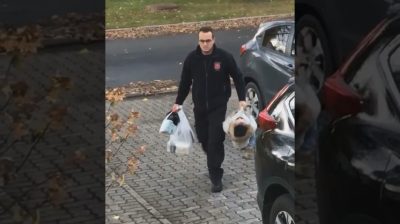 Ένας άνδρας επιστρέφει τα ψώνια στο σπίτι μαζί με τον μικρό γιο του, που φαίνεται να είναι πεισματικά ξαπλωμένος στο έδαφος.