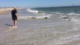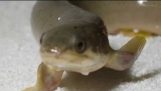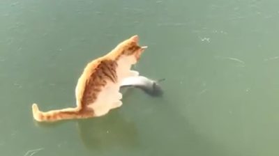 Μια γάτα προσπαθεί να πιάσει ένα ψάρι που έχει μείνει κοκαλωμένο από τον πάγο, πάνω στην επιφάνεια μιας λίμνης.