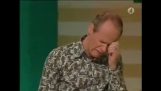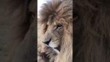 A lion is dizzy at the top of an acacia, which he has a hard time coming down!