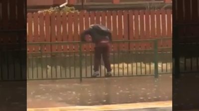 Προσπαθώντας να περάσει έναν πλημμυρισμένο δρόμο, ένας μαθητής περπάτα προσεκτικά πάνω στα κάγκελα που βρίσκονται στην άκρη του. Όμως ένα αυτοκίνητο θα χαλάσει την προσπάθειά του.