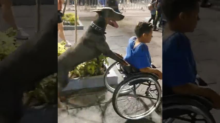 Κατά την διάρκεια του φεστιβάλ GDLuz στην πόλη Γουαδαλαχάρα του Μεξικού, ένας σκύλος σπρώχνει το αναπηρικό καροτσάκι του ιδιοκτήτη του.