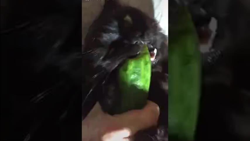 Μια γάτα τρώει με μεγάλη λαχτάρα ένα αγγούρι.
