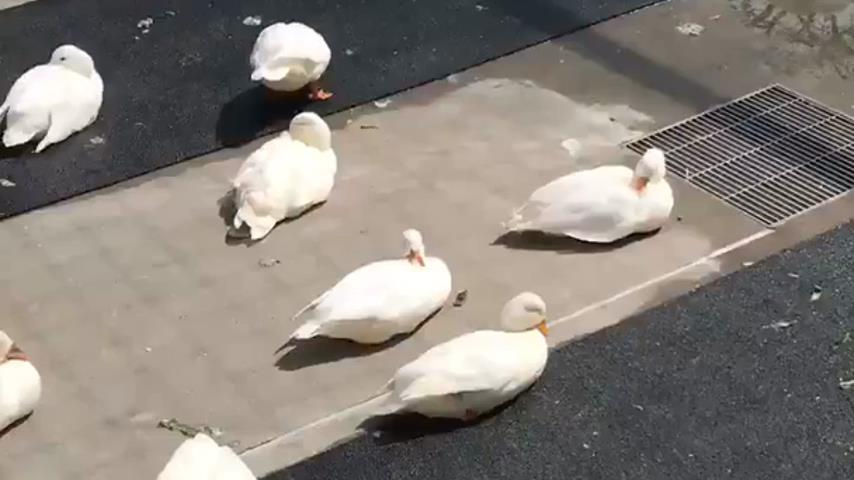 Αρκετές πάπιες κάθονται στο έδαφος και απολαμβάνουν τον ήλιο. Όμως μία από αυτές φαίνεται να το απολαμβάνει περισσότερο από τις άλλες.
