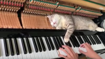 Η Haburu η γάτα κοιμάται ήσυχα πάνω στο μηχανισμό που συνδέεται με τα πλήκτρα ενός πιάνου, ενώ ο ιδιοκτήτης της Nguyễn Hoàng Minh παίζει μια μελωδία.