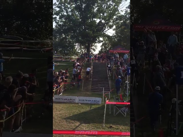 Sven Nys is climbing the stairs with his bike (cyclocross)