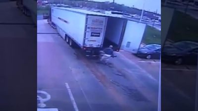 Σε ένα χώρο στάθμευσης, ένας οδηγός φορτηγού υπέστη ένα βίαιο χτύπημα από μια από τις πόρτες του τρέιλερ του, που σπρώχτηκε από τον δυνατό αέρα. Ο άντρας βρήκε ξανά τις αισθήσεις του πριν από την άφιξη ενός ασθενοφόρου και είναι καλά.