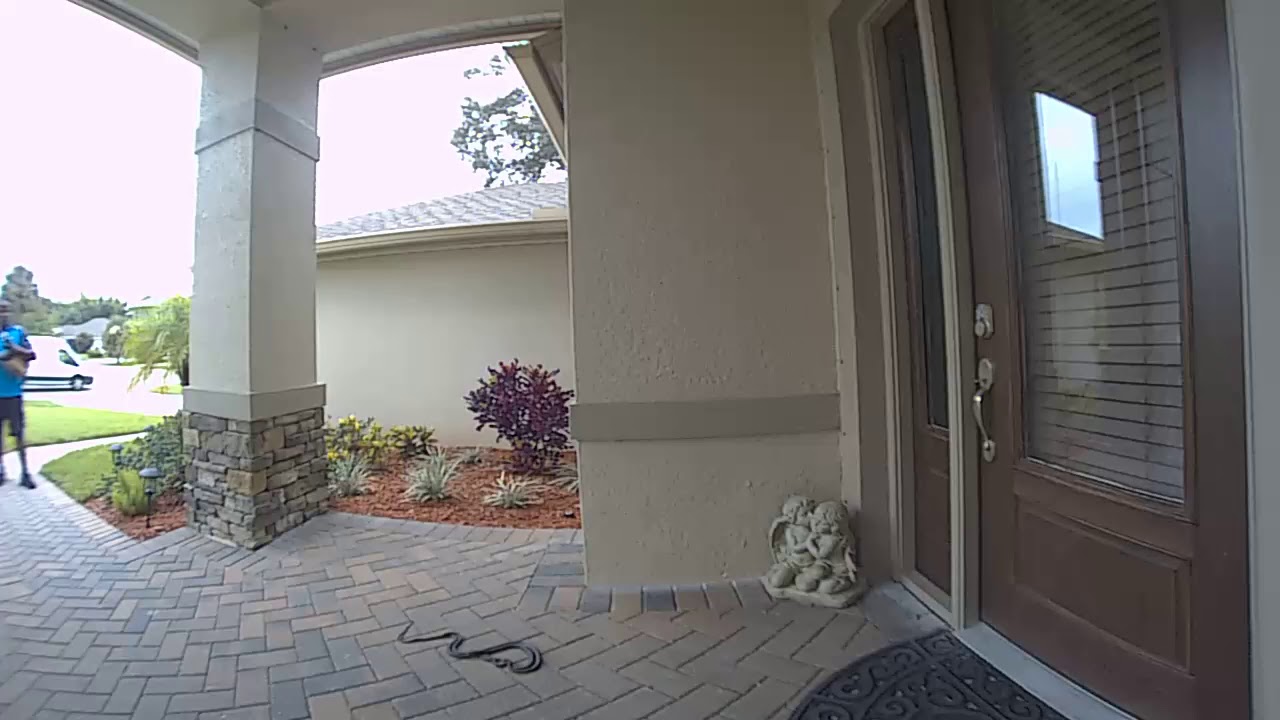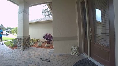 Στην πόλη Estero της Φλόριντα, μια κάμερα ασφαλείας καταγράφει τη στιγμή που ένας διανομέας της Amazon φτάνει για να παραδώσει ένα δέμα. Ξαφνικά σταματά πριν φτάσει στο κατώφλι του σπιτιού, καθώς δύο φίδια ήταν μπροστά στην πόρτα. Βλέποντάς τα, ο άνδρας σκέφτηκε ότι να κάνει την παράδοσή πετώντας το δέμα από μακριά.