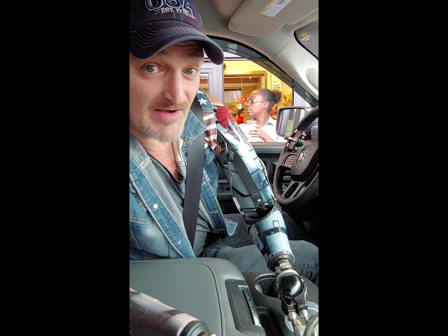 Amputee of both arms get a coffee at Starbucks