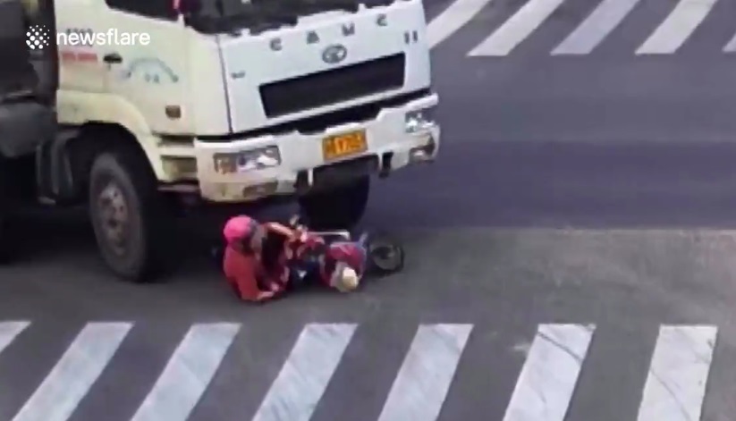 Μια γυναίκα που οδηγούσε ένα σκούτερ στην πόλη Ningbo της Κίνας, επιβίωσε από ένα τρομακτικό ατύχημα με ένα φορτηγό. Το περιστατικό συνέβη στις 18 Αυγούστου, όταν ένας οδηγός φορτηγού δεν είδε τη γυναίκα στη νεκρή γωνία του και την παρέσυρε σε μια στροφή. Ο τροχός του φορτηγού φαίνεται σαν να περνά πάνω από το κεφάλι της γυναίκας, αλλά όπως διαπιστώνουμε στη συνέχεια, ήταν απλά το κράνος. Η γυναίκα φαίνεται μετά από λίγο να έχει σηκωθεί και να προσπαθεί να ανακτήσει τα πράγματά της. Σύμφωνα με αναφορές, η γυναίκα υπέστη μόνο μερικές γρατσουνιές.