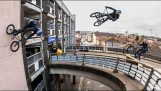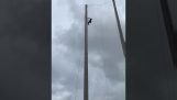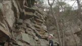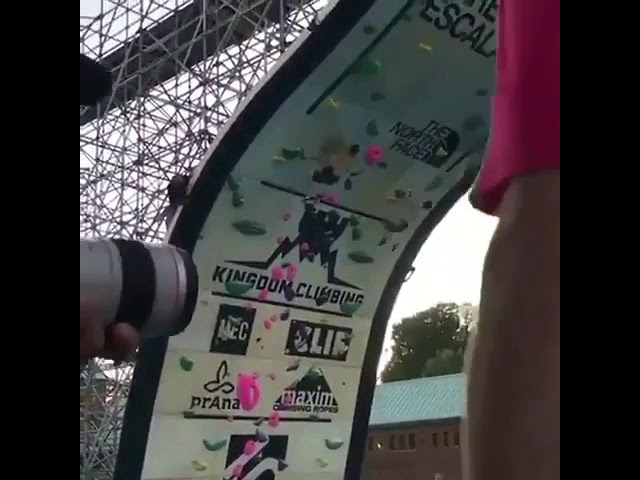 Two men quickly climb a climbing wall