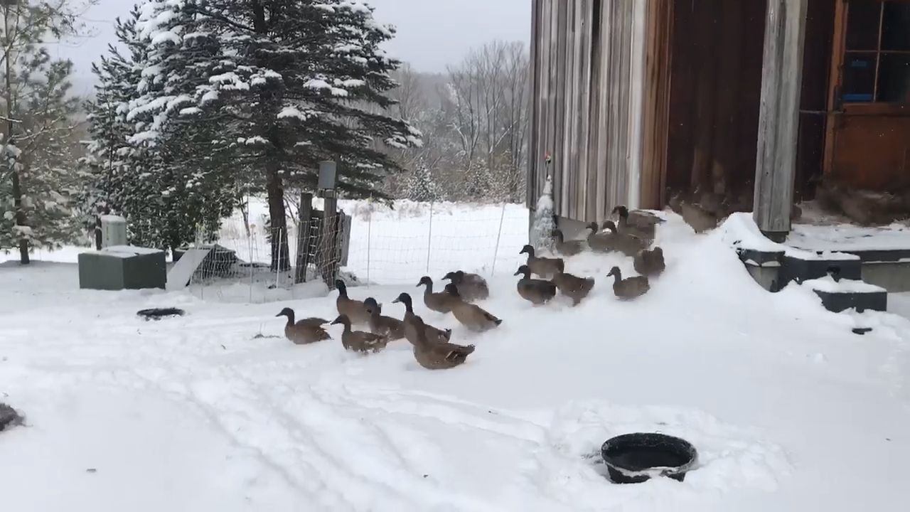 Σε ένα καταφύγιο στο Βερμόντ στις Ηνωμένες Πολιτείες, ένα κοπάδι από πάπιες ανακαλύπτουν για πρώτη φορά το χιόνι καθώς βγαίνουν από τον στάβλο τους. Η αντίδρασή τους είναι πολύ αστεία καθώς αμέσως γυρίζουν πίσω για να ζεσταθούν.