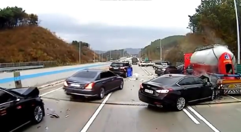Στις 28 Νοεμβρίου στον παγωμένο αυτοκινητόδρομο μεταξύ των πόλεων Gwangju και Wonju στη Νότια Κορέα, συνέβη μια μεγάλη καραμπόλα 21 αυτοκινήτων. Ένας άνδρας που είχε πιθανότατα βγει από το όχημά του μετά τις πρώτες συγκρούσεις, προσπαθούσε απεγνωσμένα να προειδοποιήσει τους εισερχόμενους οδηγούς να κόψουν ταχύτητα. Όμως ο ίδιος κινδύνευσε σοβαρά από δύο αυτοκίνητα που έχασαν τον έλεγχο καθώς φρέναραν στον πάγο. Στη συνέχεια ακολούθησαν και άλλα οχήματα, πέφτοντας το ένα πάνω στο άλλο σε αλλεπάλληλες συγκρούσεις.