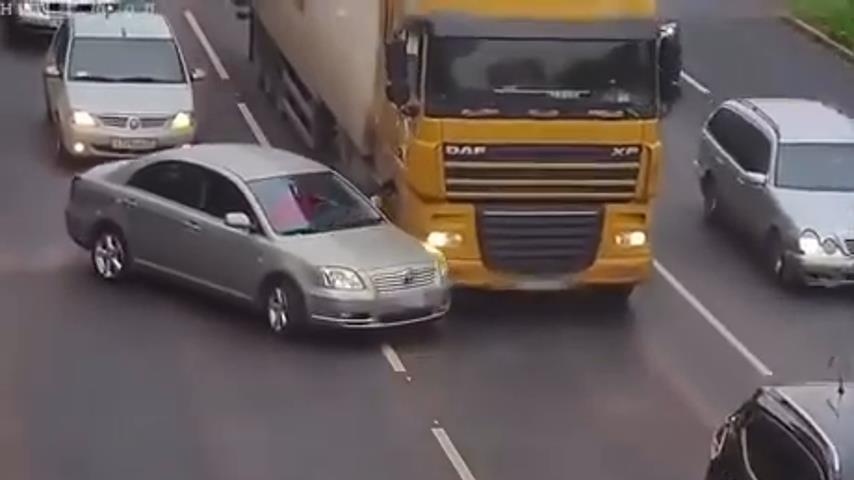 Σε δρόμο της Μόσχας στη Ρωσία ένα αυτοκίνητο θα επιχειρήσει να μπει στην αριστερή λωρίδα, αλλά φαίνεται να είναι εκτός του οπτικού πεδίου ενός οδηγού φορτηγού που κινείται από αριστερά. Το φορτηγό θα ξηλώσει τον προφυλακτήρα και την πρόσοψη του αυτοκινήτου, ενώ η έκρηξη του ελαστικού του φορτηγού θα του προκαλέσει ακόμα μεγαλύτερη ζημιά.