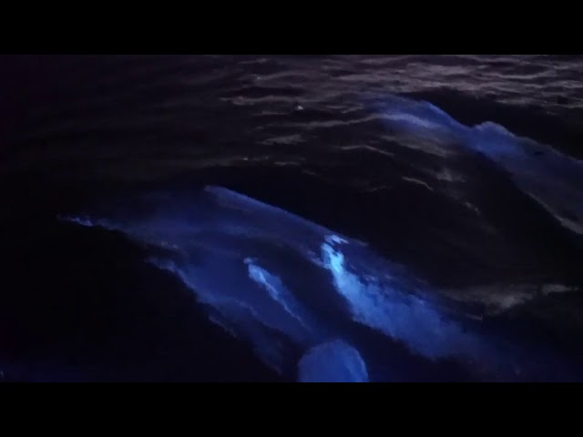 Μια ομάδα από “φωτεινά” δελφίνια κολυμπούν κοντά σε ένα σκάφος στο Newport Beach της Καλιφόρνια. Το φως εκπέμπεται από το βιοφωτιζόμενο φυτοπλαγκτόν, που διαταράσσεται από την κίνηση του νερού. Αυτό το φαινόμενο μπορεί να συμβεί όταν υπάρχει μεγάλη ποσότητα φυτοπλαγκτόν στο νερό, έτσι ώστε το εκπεμπόμενο φως να μπορεί να φανεί με γυμνό μάτι.