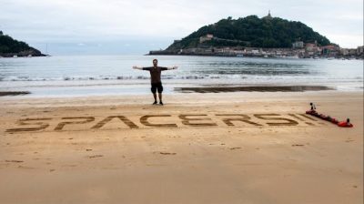 During a show, an acrobat tries to sit on a chair controlled by a robotic arm.