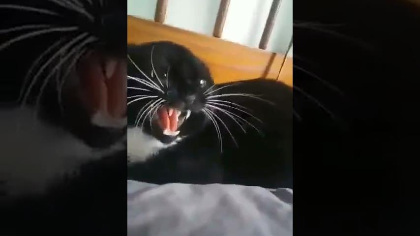 Ένας άντρας μιμείται το νιαούρισμα μιας αγριεμένης γάτας, καταγράφοντας την αντίδραση μιας γάτας πίσω του.
