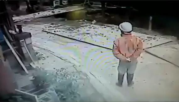Σε μια οικοδομή, ένας εργάτης ήταν πολύ τυχερός όταν ένας γερανός ανετράπη και έπεσε ακριβώς δίπλα του μαζί με το φορτίο.