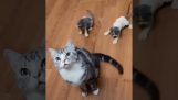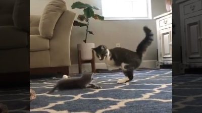 Μια γάτα χωρίς μπροστινά πόδια που έχει προσαρμοστεί πλήρως στην αναπηρία της, παίζει πολύ τρυφερά με ένα γατάκι.