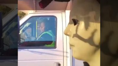 Ένας άνδρας τρομάζει τους περαστικούς οδηγούς φορώντας τη μάσκα του δολοφόνου από την ταινία τρόμου Halloween.