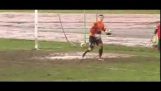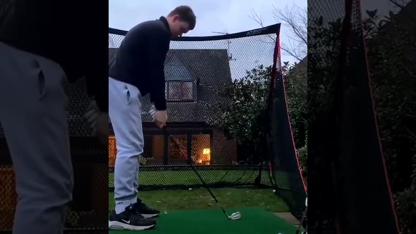 Ένας άνδρας προπονείται στο γκολφ με ένα δίχτυ, το οποίο όμως βρίσκεται στην κατεύθυνση προς το σπίτι του.