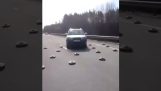 Στο ζωολογικό πάρκο Baoding στο Hebei της Κίνας, μια θαρραλέα χήνα τα βάζει με δύο τίγρεις.