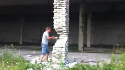 Στη Ρωσία , ένας νεαρός προσπαθεί να ρίξει ένα ετοιμόρροπο τσιμεντένιο υπόστεγο, αφαιρώντας τα τούβλα από μια κολόνα.