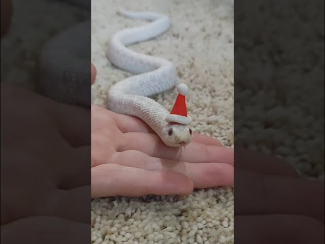 A small white Heterodon nasicus snake named Kirby walks among the presents with a Santa hat on its head. Namely, the hat was made of plasticine and glued to Kirby’s head with water.