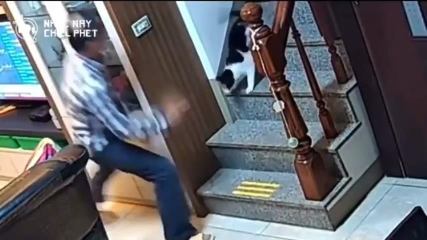 Ένας άνδρας τρομάζει τη γάτα του καθώς αυτή κατεβαίνει τη σκάλα. Αργότερα η γάτα θα εκδικηθεί με τον ίδιο καριβώς τρόπο.