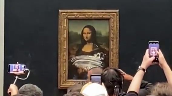 Την Κυριακή 29 Μαΐου του 2022 στο Μουσείο του Λούβρου στο Παρίσι, ένας ακτιβιστής έριξε τούρτα τον πίνακα της Μόνα Λίζα. Ο άνδρας ντυμένος σαν ηλικιωμένη κυρία σε αναπηρικό καροτσάκι, πέταξε ένα κομμάτι τούρτα στον πίνακα της Μόνα Λίζα και προσπάθησε να σπάσει το προστατευτικό τζάμι. Στη συνέχεια άπλωσε την τούρτα στο γυαλί και πέταξε τριαντάφυλλα τριγύρω προτού συλληφθεί από την ασφάλεια. Στη συνέχεια, ο 36χρονος είπε: «Όλοι οι καλλιτέχνες, σκεφτείτε τη Γη. Γι’ αυτό το έκανα αυτό. Σκεφτείτε τον πλανήτη». Εισήχθη στο ψυχιατρείο της αστυνομίας του Παρισιού