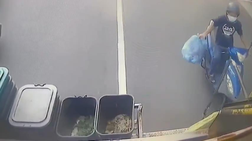 Ένας άντρας έχασε το πέρασμα του απορριματοφόρου, και προσπαθεί να το προλάβει με ένα σκούτερ και τη σακούλα σκουπιδιών στο χέρι. Μόλις φτάνει πίσω από το φορτηγό, επιχειρεί να πετάξει την σακούλα με τα σκουπίδια στον κάδο. Όμως δεν θα τα καταφέρει και η σακούλα θα χτυπήσει στο τιμόνι του. Έχοντας χάσει την ισορροπία του, πέφτει από το σκούτερ με τη σακούλα στο χέρι.