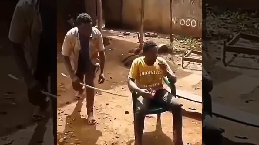 Ένας άνδρας κάνει μια αστεία φάρσα σε ένα φίλο του, που κάθεται σε μια πλαστική καρέκλα.