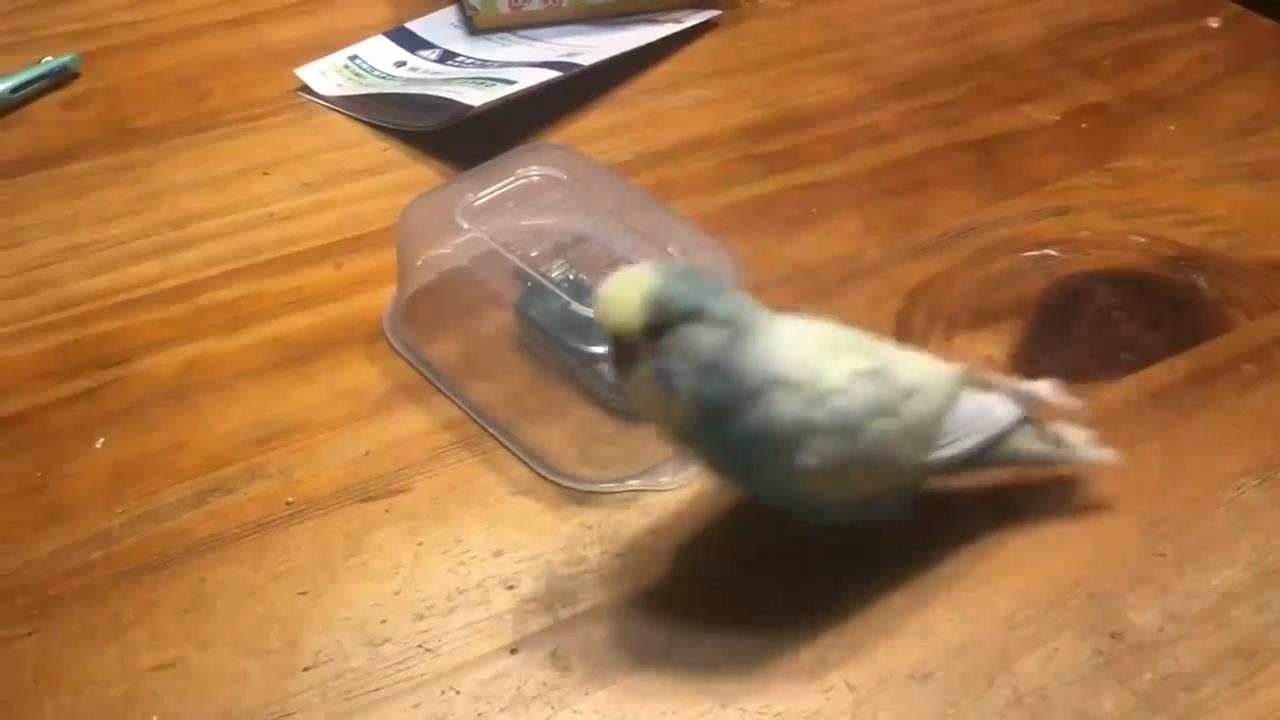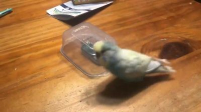 Ένας μικρός παπαγάλος θέλει να μπει κάτω από ένα πλαστικό δοχείο κια να κάνει μια βόλτα…