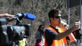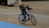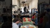 Επίδειξη των εργαλείων ακριβείας για εκσκαφείς της εταιρίας Engcon, στην έκθεση “Motorshow 2023”. Ο χειριστής του εκσκαφέα κόβει μια πίτσα και τη σερβίρει μαζί με μπύρες στους θεατές.